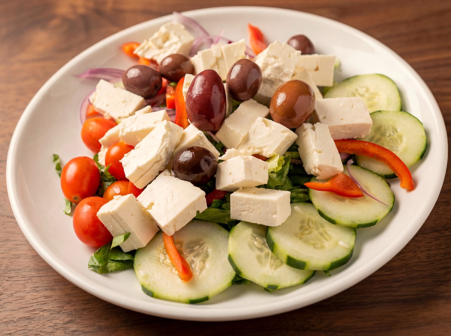 A refreshing mix of juicy tomatoes, crisp cucumbers, red onions, Kalamata olives, and creamy feta cheese, drizzled with a light Greek vinaigrette.