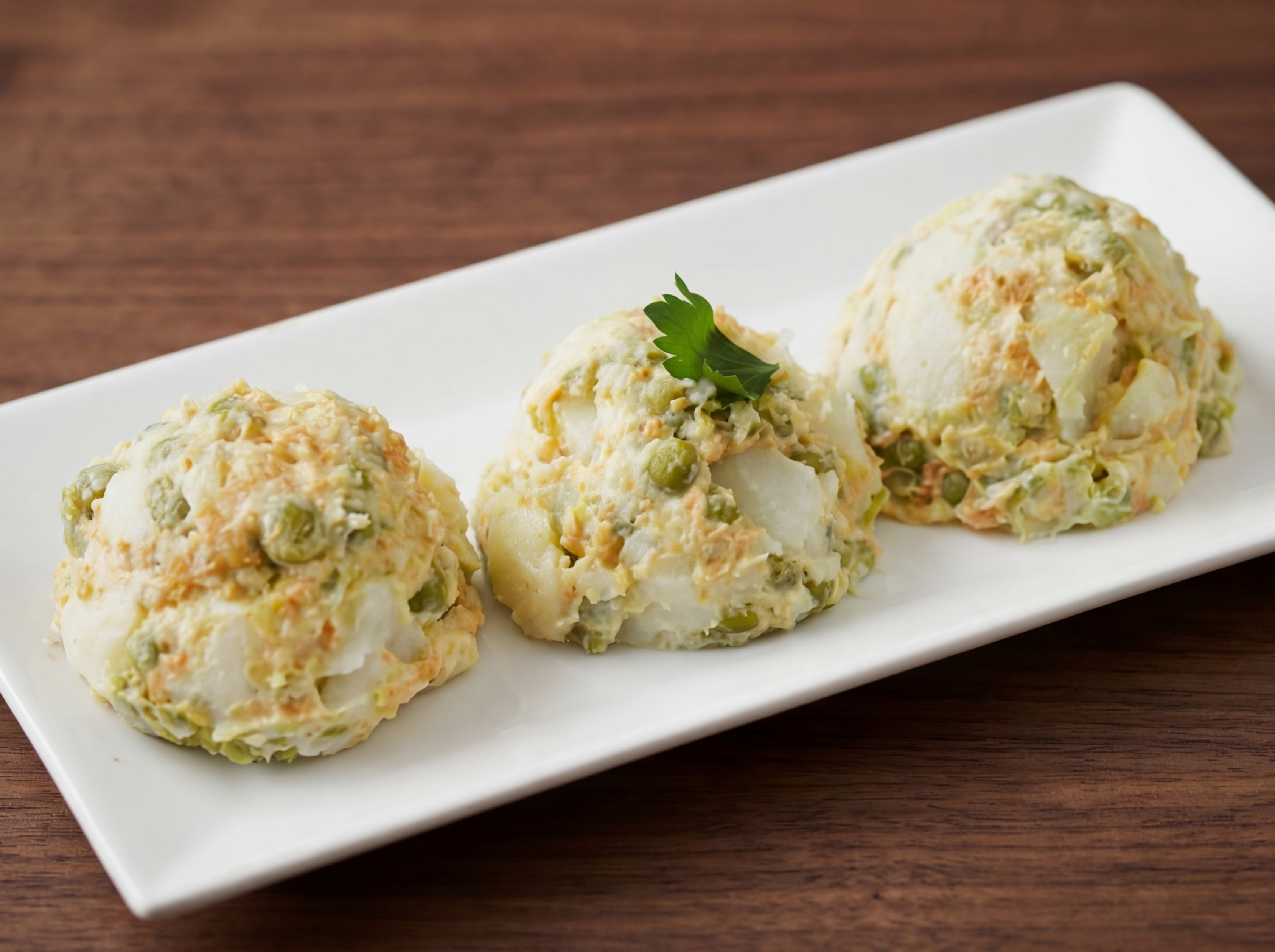 A traditional creamy potato salad made with diced potatoes, carrots, peas, and a touch of mayonnaise.